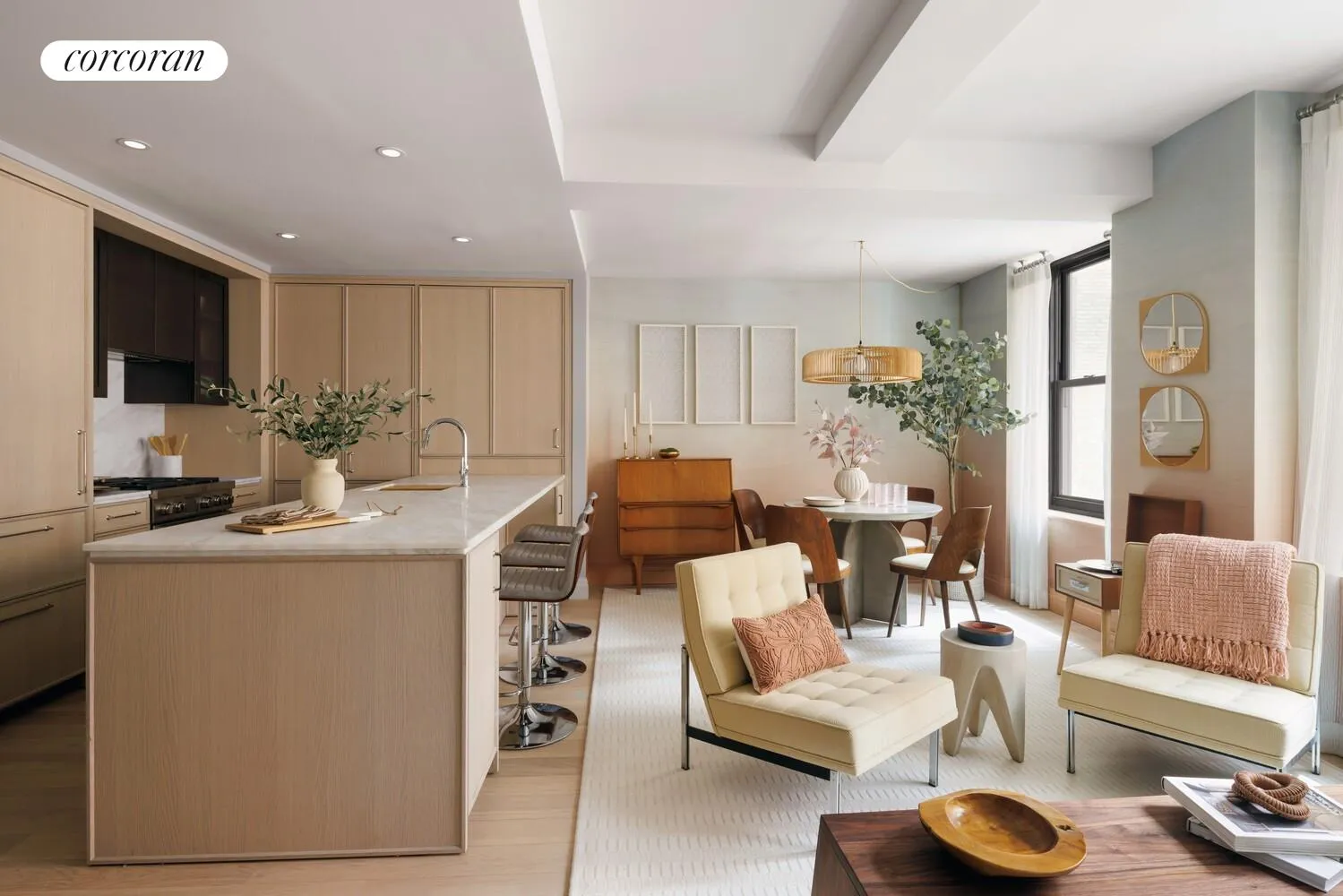 Residence 5J boasts a custom Italian kitchen by Boffi featuring a hand selected honed Namibia Rose marble countertop and backsplash, white oak cabinetry, fluted, reflective bronze upper doors and Waterworks polished chrome hardware. Professional-grade appliances include Sub-Zero refrigerator, Wolf range, Wolf speed oven, wine fridge, and Cove dishwasher. No expense has been spared.