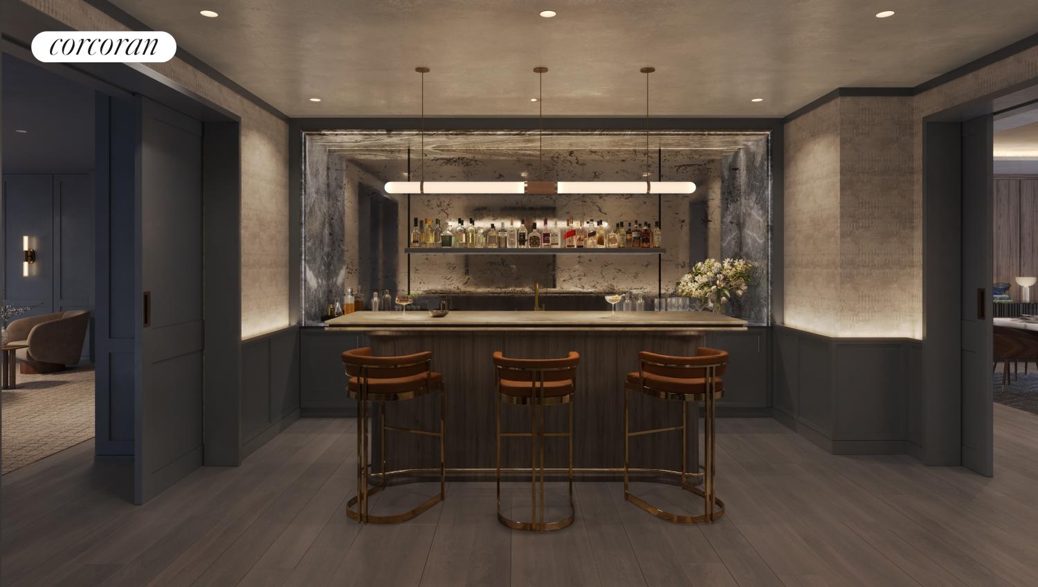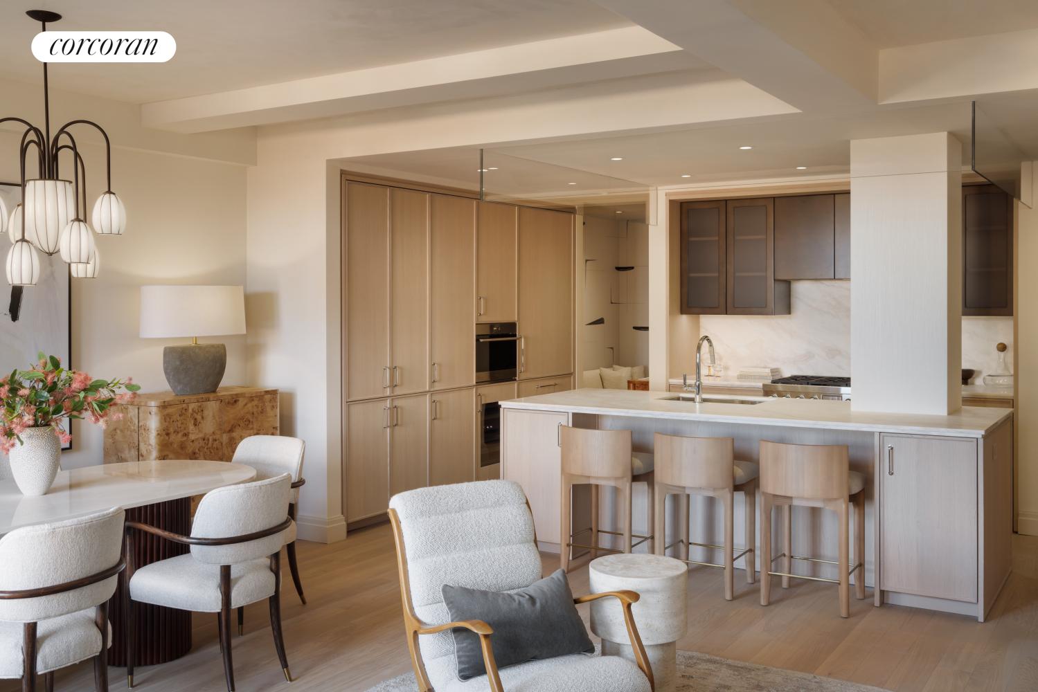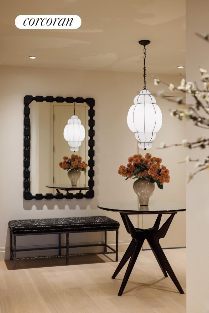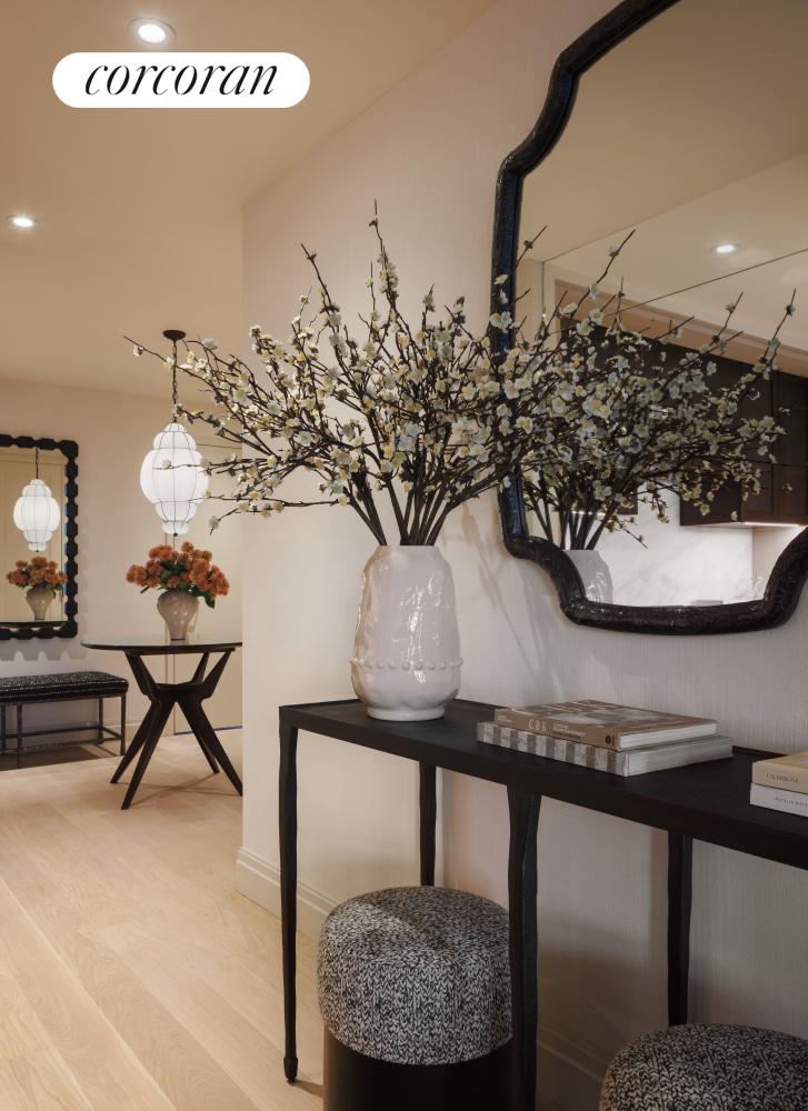 A grand entry foyer welcomes you to Residence 8B. Boasting a custom Italian kitchen by Boffi featuring a hand selected honed Namibia Rose marble countertop and backsplash, white oak cabinetry, fluted, reflective bronze upper doors and Waterworks polished chrome hardware. Professional-grade appliances include Sub-Zero refrigerator, Wolf range, Wolf speed oven, wine fridge, and Cove dishwasher. An extra-large pantry or secluded home office can be found adjacent to the kitchen. No expense has been spared.