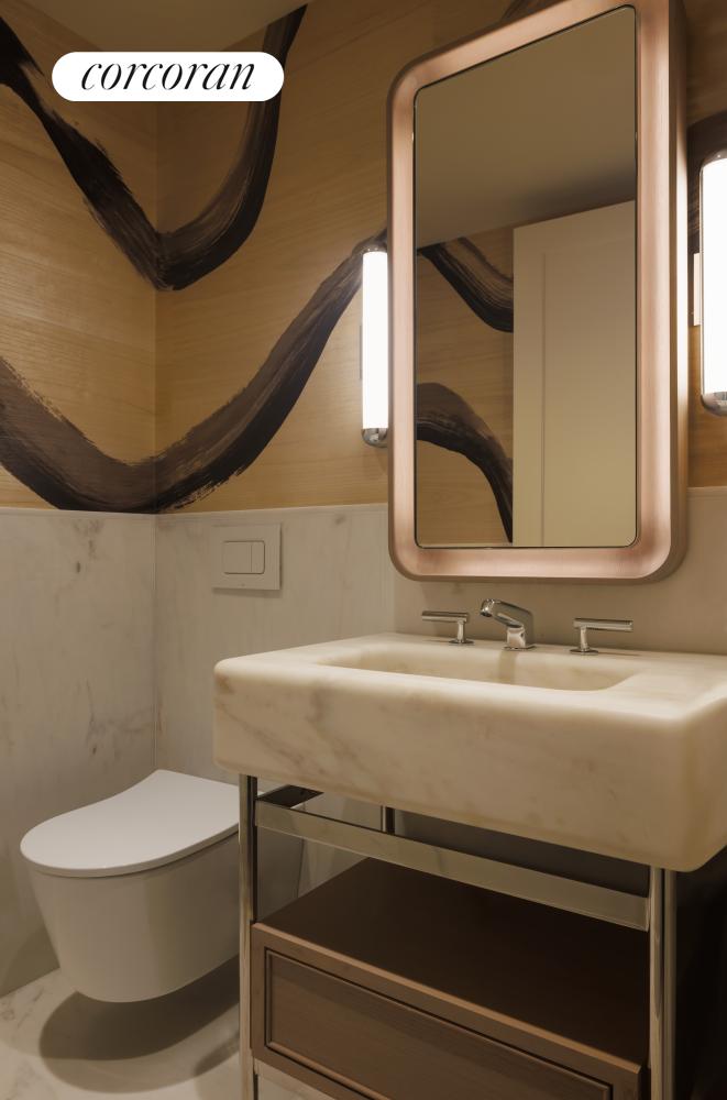 The stunning powder room is delivered with a custom Thomas Juul Hansen designed Estremoz marble monolithic stone vanity with honed Estremoz marble wainscot and flooring, Waterworks fixtures in polished chrome and a Duravit wall mounted toilet.