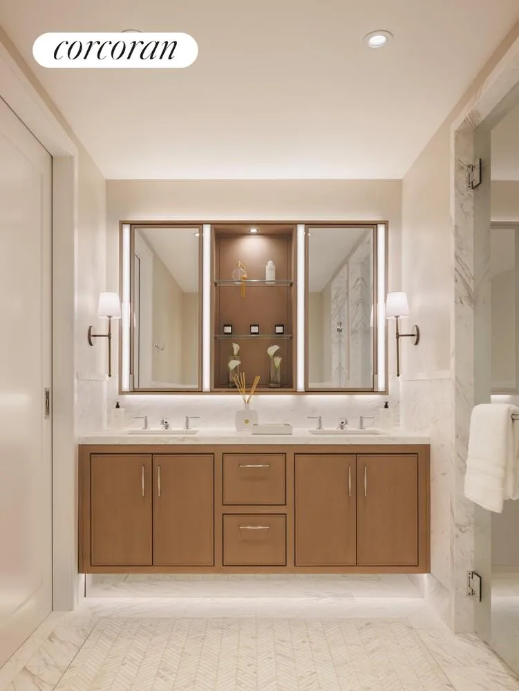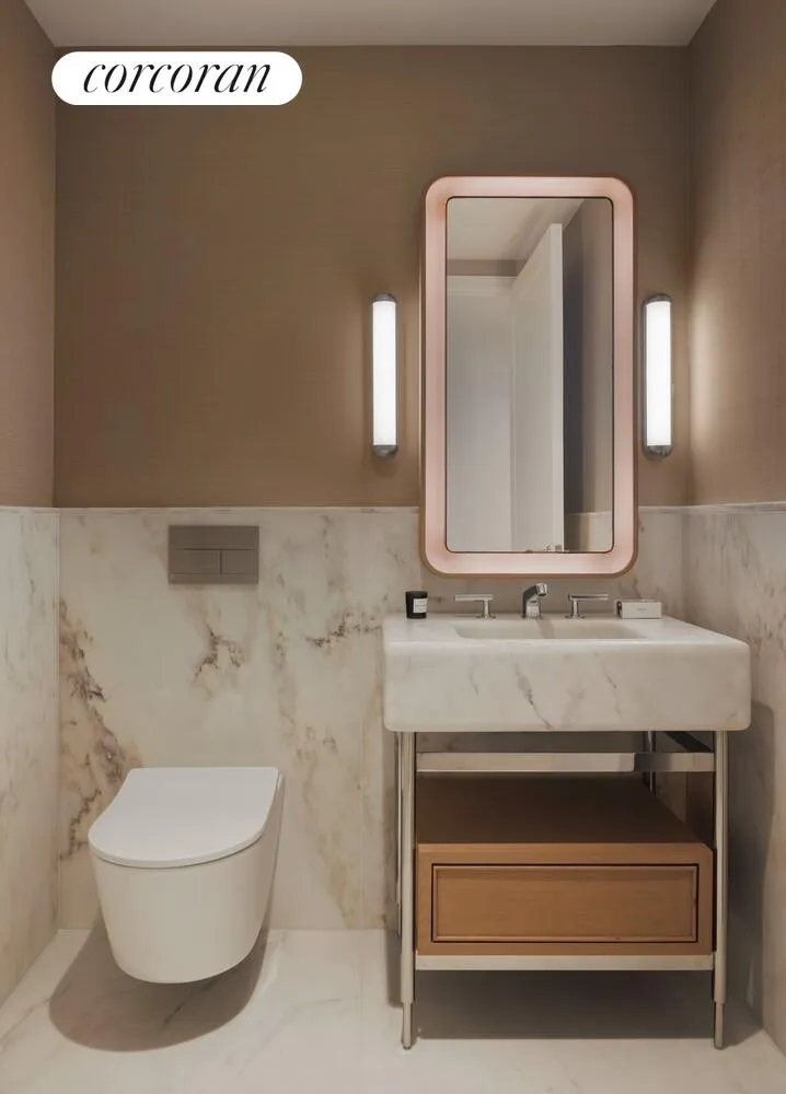 The elegant secondary bathrooms are outfitted with a custom Thomas Juul Hansen designed white oak vanity, honed Thassos marble wainscot, countertop and flooring, Waterworks fixtures in polished chrome and a Duravit wall mounted toilet.