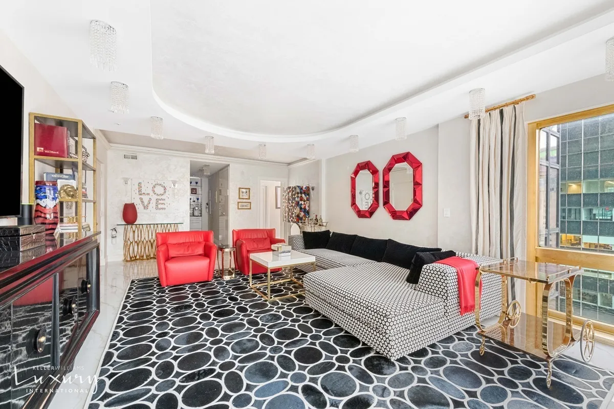 Gorgeous white marbleized porcelain floors and elegant crystal ceiling lighting run throughout the apartment’s spacious rooms creating a refined backdrop for luxurious living, beautifully enhanced with gold-leaf accent on the window mullions. The generous living room is enhanced by iconic City views, including Fifth Avenue and the top of the magnificent Aman New York, and comfortably provides room for gracious entertaining and dining.