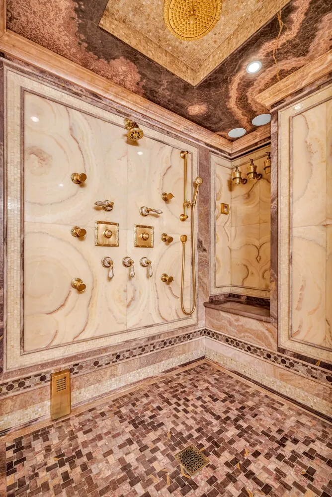 Each bathroom is a work of art in its own right-one is enveloped in alabaster, another features rare amethyst sourced from Tanzania, while the others showcase stunning onyx and lapis lazuli, creating a one-of-a-kind living experience. Adding to the grandeur, stunning Baccarat chandeliers illuminate the space, casting a warm, opulent glow that enhances the home's timeless elegance.