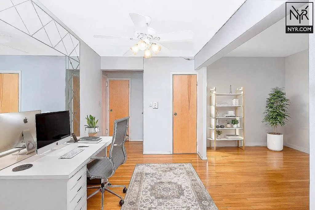 Upon entering the foyer of the apartment, you are drawn to the natural light illuminating through the north windows of the large living room and east window of the eat-in kitchen. Beyond the functional foyer which is outfitted with a triple-closet bank, the layout unfolds into a versatile gallery space perfect for a dedicated home office (as shown in the virtually staged photo) or a child’s play area. From there, you can transition into the expansive living room or navigate toward the oversized eat-in kitchen. Continuing beyond the kitchen, a hallway leads past the windowed bathroom into the king-sized bedroom.