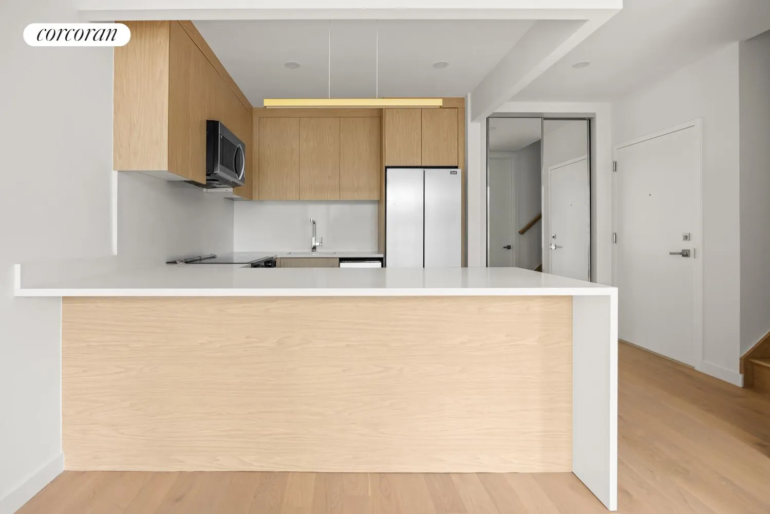 Bathed in southern light, the main level features an open living and dining area anchored by a wall of glass that leads to the first of two private outdoor spaces. The sleek U-shaped kitchen is ideal for both cooking and entertaining, with ample cabinetry, generous counter space, and a breakfast bar that flows into the dining area. A second bedroom, coat closet and convenient powder room complete the entry level.