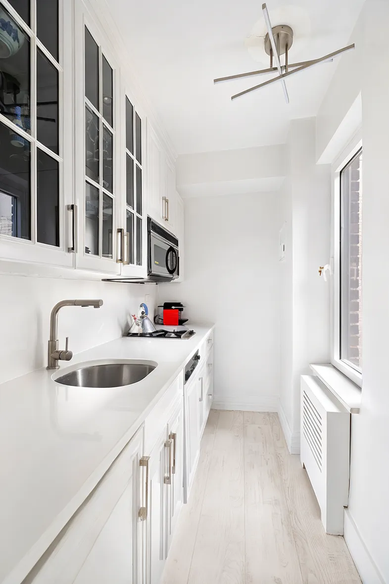 Bring your toothbrush & move into this newly renovated 16th floor sun-filled Park Avenue studio with a peek of Central Park. Gut renovated with owners sparing no expense which includes: 5 Skyline tilt & turn windows, Hamilton through wall A/C, and closets by Transform in the dressing room & entry. The bathroom is by Porcelanosa and includes a Restoration Hardware Thaddeus vanity, Toto toilet & Waterworks fixtures. The main room includes a Sony TV over the electric fireplace & has a Shabby Chic custom barn door which closes off to accommodate a bright, windowed separate home office.