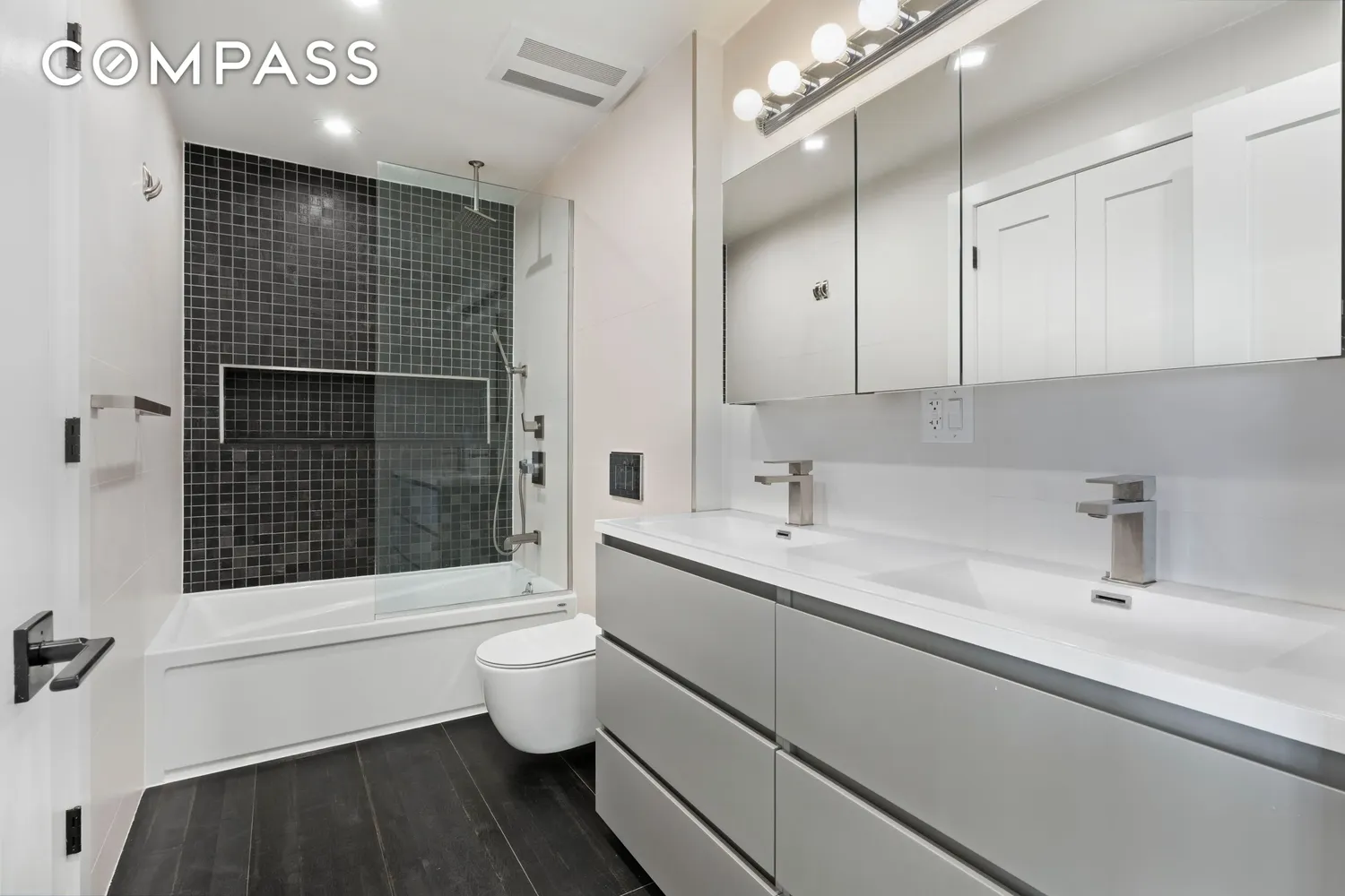 Inside, the generously sized bathroom is nothing short of luxurious, featuring a deep soaking tub, radiant heated floors, and pristine porcelain tiles. The double vanity provides ample space, while the stackable washer/dryer adds convenience to your daily routine. For year-round comfort, this home offers central A/C, ensuring a perfect climate no matter the season. Additional perks include a large private storage room, a common rooftop deck with breathtaking panoramic views, a secure video intercom system, and a secure package room for ultimate peace of mind.