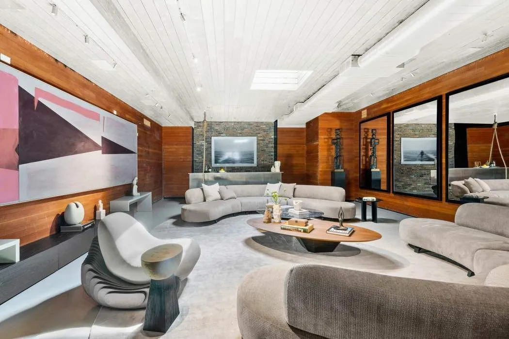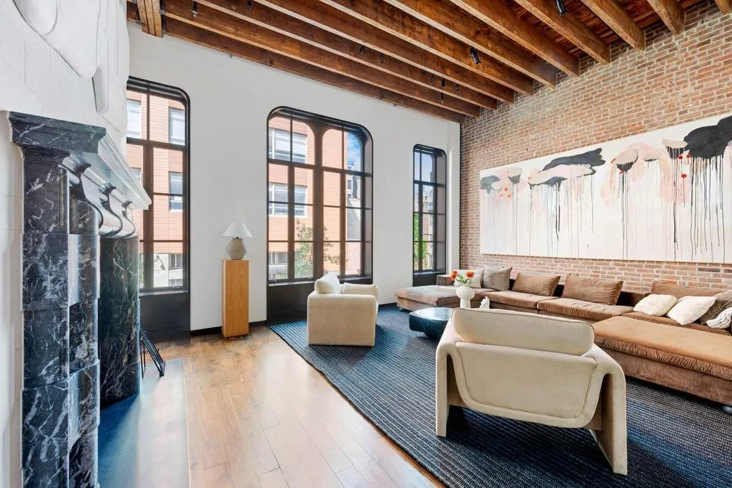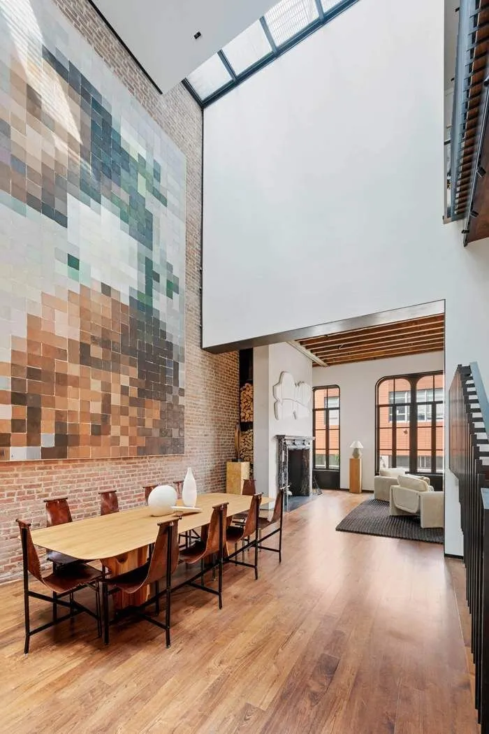 Enter the house via the foyer’s staircase which leads to an awe-inspiring 26-foot-high ceiling, crowned by a skylight that floods the main entertaining space with natural light. the expansive living area includes exposed beams, brick walls, 25” feet of windows and a large wood-burning fireplace. The adjacent chef’s kitchen has soaring 15-foot ceilings with exposed wood beams, and French doors that open onto a beautifully landscaped 1,000-square-foot south-facing terrace equipped with built-in grilling station and irrigation—perfect for seamless indoor-outdoor living.