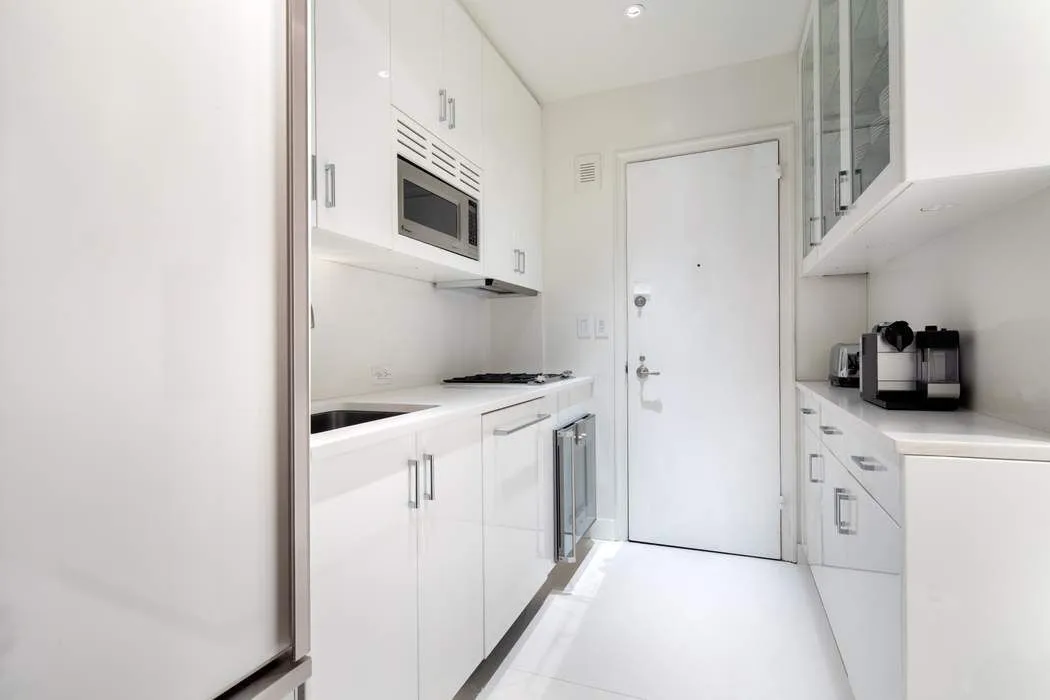 Enter the generous stunning central gallery with gorgeous marble floors, a beautiful domed ceiling, large closet and upscale powder room. While proceeding to the dramatic entertaining space, fabulous hidden folding doors, which appear as part of the paneling, can be extended to close off the gallery and living area for privacy if desired. The expansive southwest corner living room affords an ideal backdrop for entertaining. Adjoining via pocket doors is a formal dining room featuring tasteful built-ins for fine china, and dark herringbone-pattern wood floors. Across the hall is a modern kitchen styled with sleek white cabinetry and countertops, and top-of-the-line appliances for the chef. At right is extensive built-in storage, and a convenient washer-dryer.