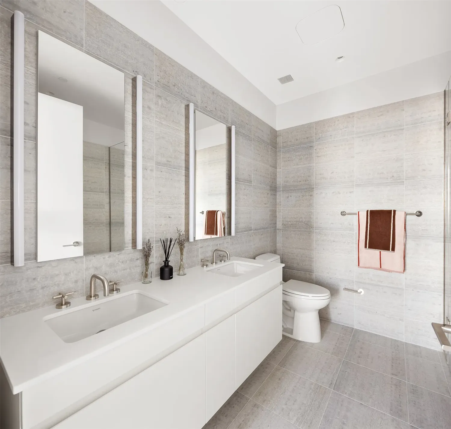 Ensuite primary bathrooms relax the senses with radiant heated floors and River Stone clad walls. A curbless, glass enclosed shower with infinity drain offers thermostatically controlled hand and rain showers in brushed nickel by Phylrich to enhance the spa-like effect. Final touches include Robern medicine cabinets over double vanities and a power source provided for bidet seat connection. Charm abounds in the powder room where custom wainscoting and select finishes from Annabelle Selldorf’s Vica collection are on display.