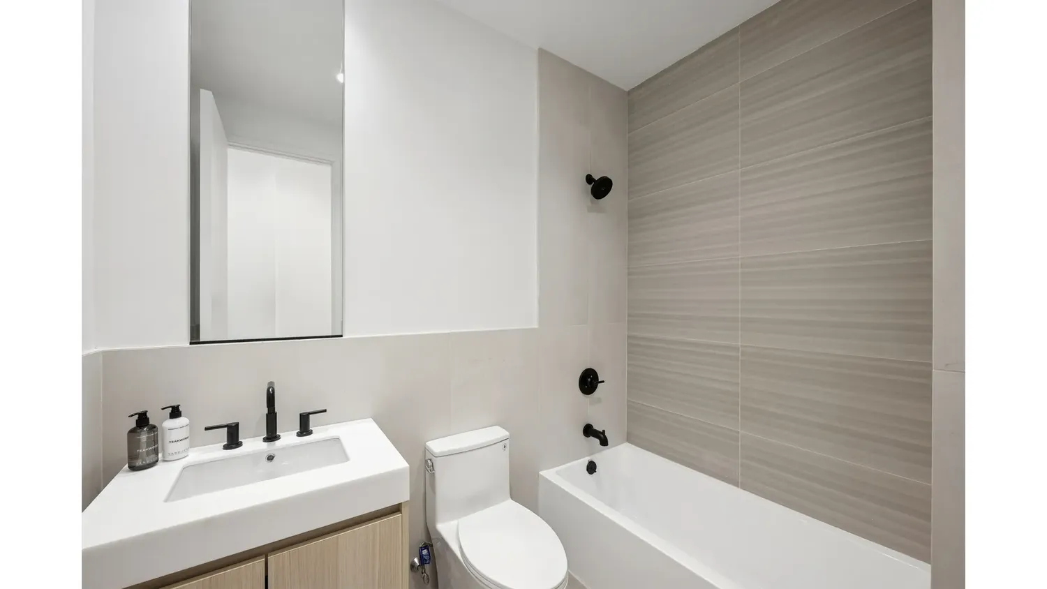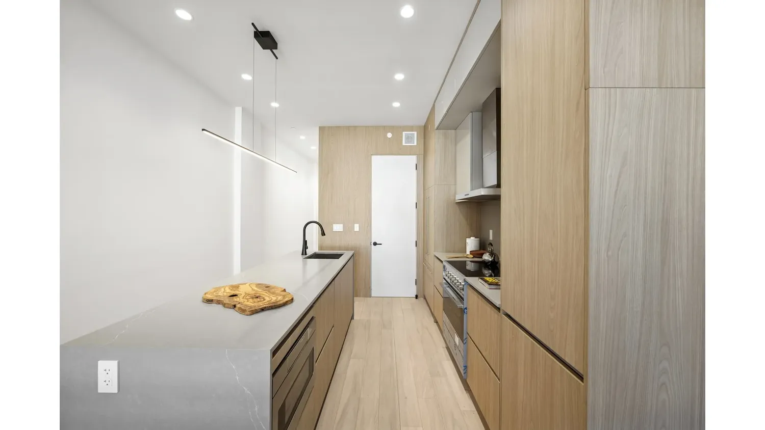 Residence 2 is a generously proportioned two-bedroom two-bathroom home. The expansive living and dining room stretches nearly 20 feet in length and is anchored by a wall of floor to ceiling Pella windows, delivering light, air, and a seamless connection to the neighborhood beyond. Wide plank oak floors run throughout, adding warmth and continuity to the space. The kitchen is a true centerpiece, designed for both everyday living and entertaining. Custom wood cabinetry, integrated appliances, and a massive island create a space that feels both refined and functional. Thoughtful storage, clean lines, and high quality materials elevate the kitchen into the heart of the home. The primary bedroom offers excellent proportions and features a dedicated walk in closet, providing storage rarely found in new construction condominiums. The en suite bathroom is finished with modern tile, custom millwork, and sleek black fixtures, creating a calm and contemporary retreat. The second bedroom is well sized and flexible, ideal for guests, a home office, or a nursery, with a second full bathroom conveniently located nearby.