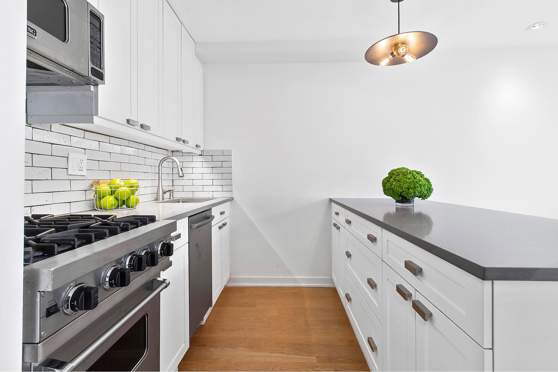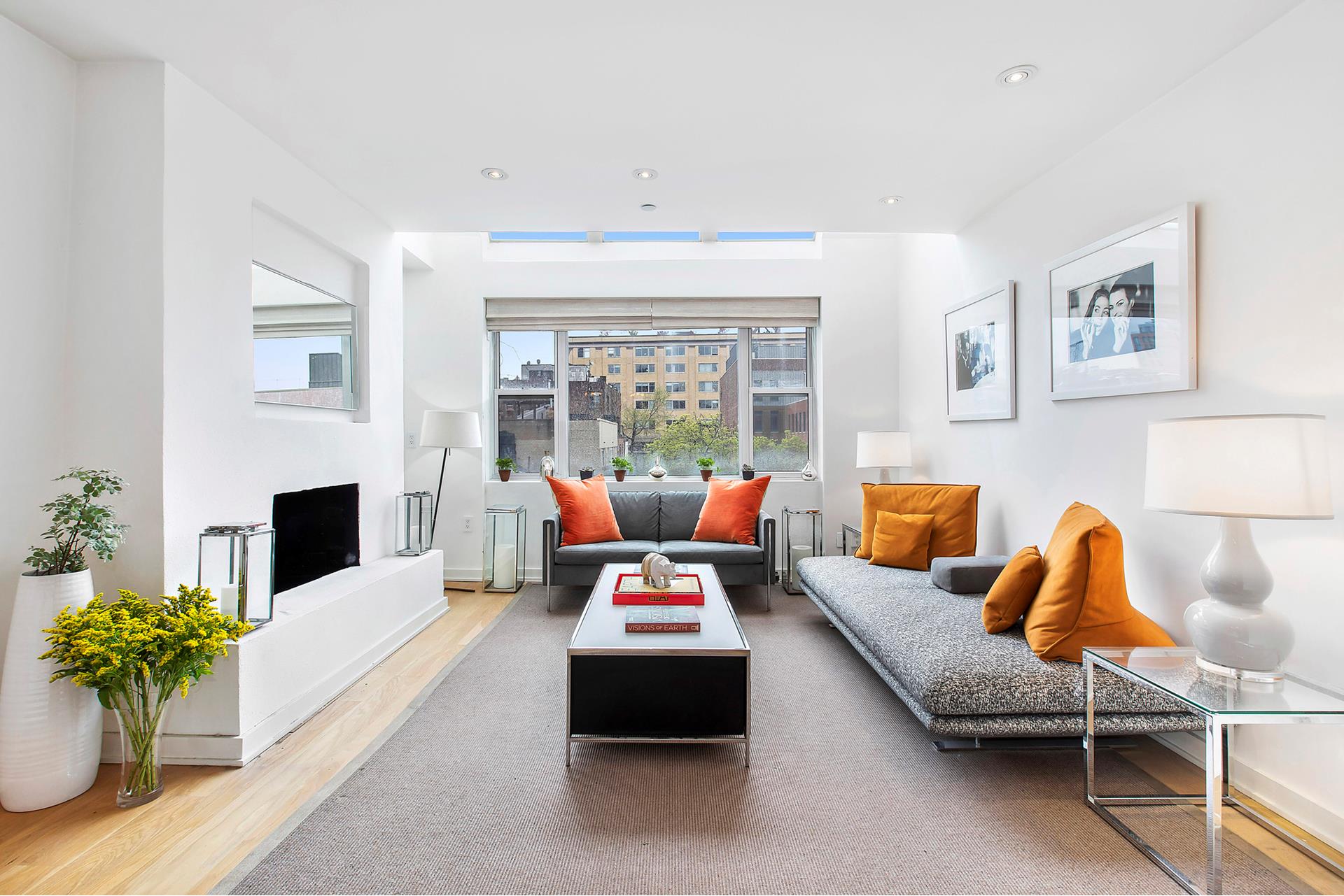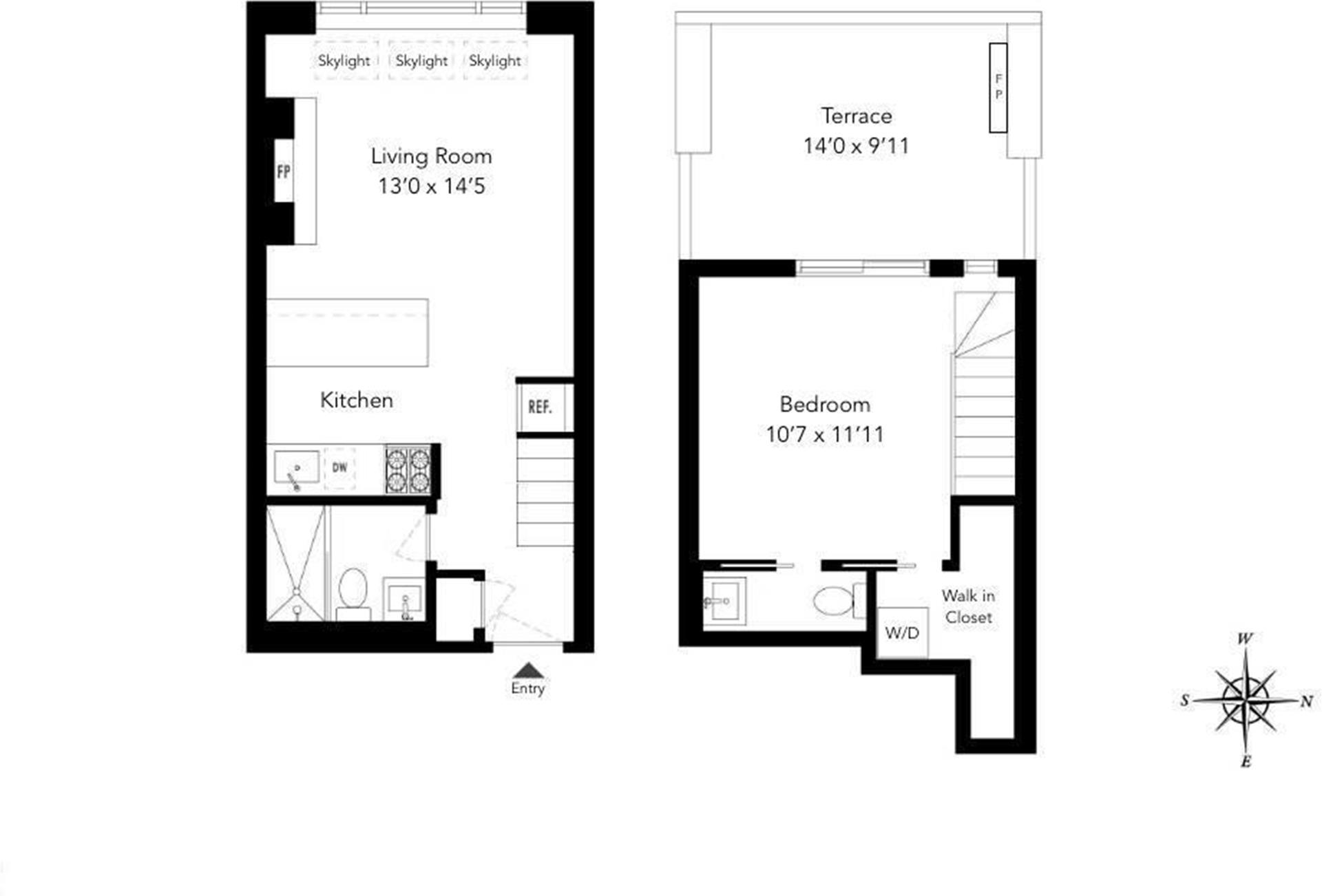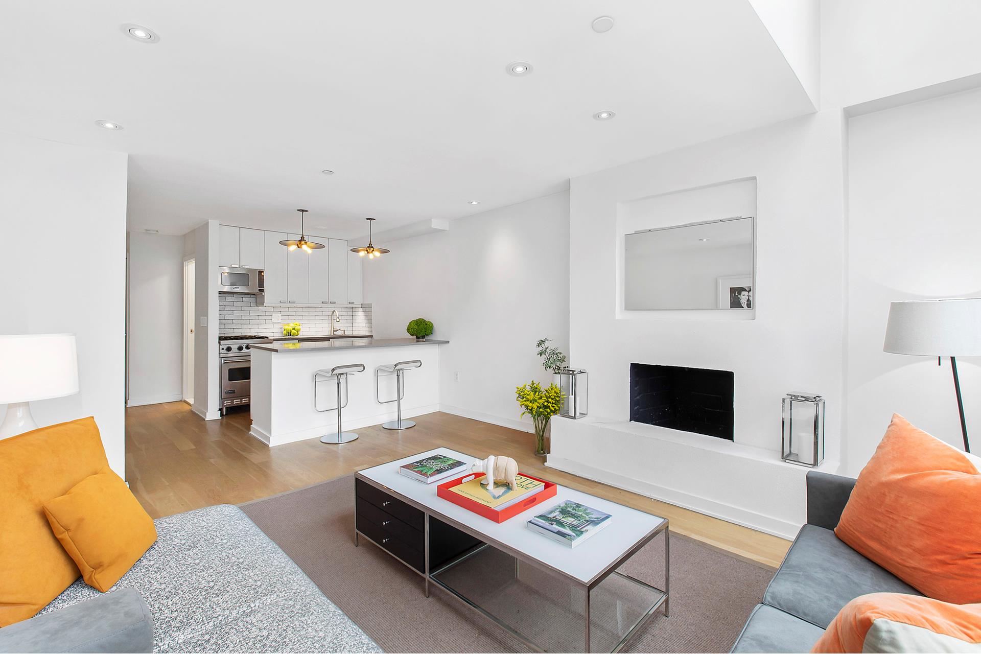 Upon entering PHC, you are welcomed into the open kitchen/living room with stairs leading up to the bedroom and private roof deck. To your left, is an entry closet and the newly renovated (and never used) full bath with glass door shower. The open kitchen features a viking stove and microwave, as well as a dishwasher. The kitchen has a peninsula/breakfast bar open to the living room that can easily accommodate 2-3 stools. The west facing living room has large windows, equipped with window treatments, and a skylight overlooking the courtyard as well as a decorative fireplace. Upstairs is the king-size primary bedroom with a half bath, and a walk-in closet which also houses the washer/dryer. Off the bedroom lies the private roof deck with Hudson River views and skyline views.