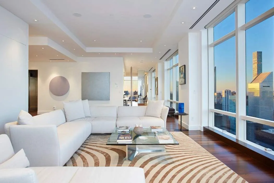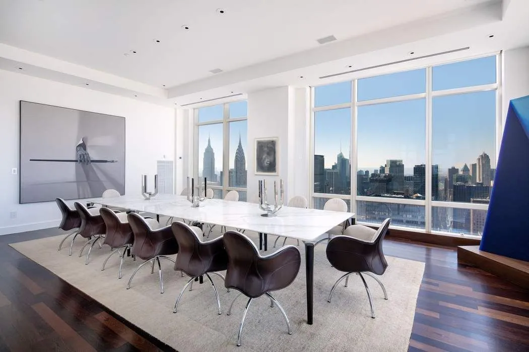An expansive corner double living room features stunning East River and northern skyline views, while the formal dining room showcases dazzling West and North exposures—ideal for sunset viewing. Between the two, a windowed chef’s dream kitchen boasts top-of-the-line appliances, including a double Sub-Zero refrigerator, oversized wine cooler, dual refrigerator drawers, double oven, and a separate laundry area. The long marble-topped bar invites effortless entertaining both large and intimate.