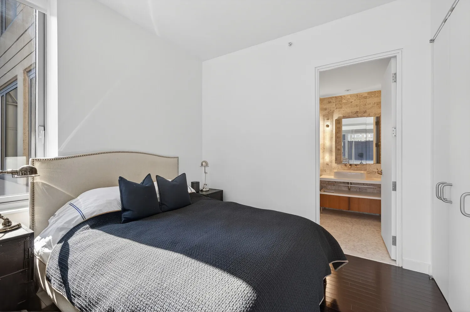 The bedroom is a quiet retreat with a generous closet and direct access to a spa-like bathroom finished in sandblasted marble, featuring an oversized vanity and Duravit soaking tub. An in-unit washer and dryer complete the home.