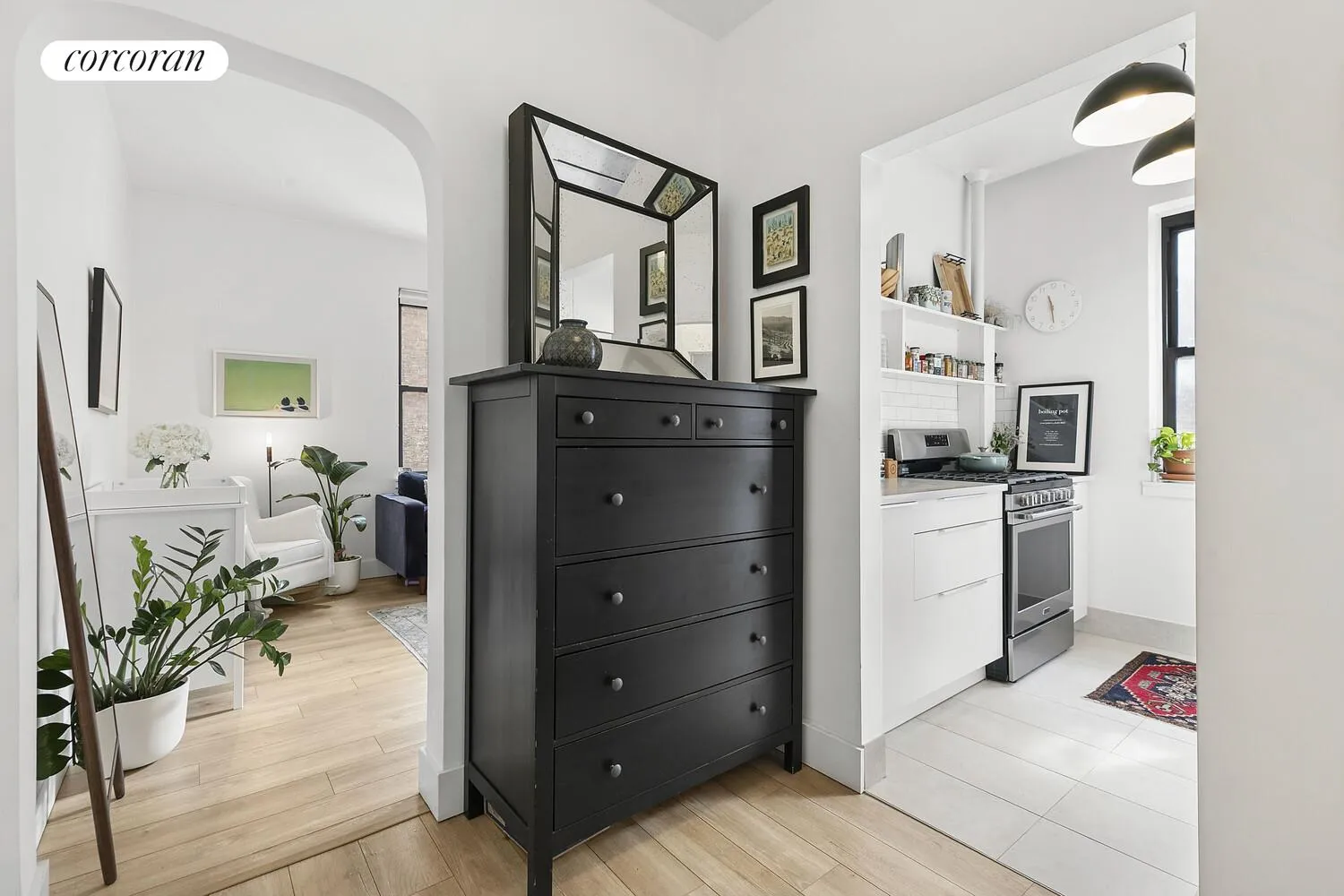 A welcoming separate foyer leads to three generously sized closets with custom organizers. The renovated bathroom showcases classic white subway tile and a frameless glass shower wall. Wide-plank engineered wood floors, along with updated doors, hardware, and baseboards, complete this move-in-ready home.