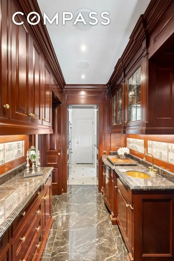 A walk-through pantry/wet bar leads to a windowed galley-style kitchen equipped with marble countertops, bespoke cabinetry, and top-of-the-line stainless steel appliances. Adjacent to the pantry is an en-suite staff room or guest suite with eastern exposure. For your convenience, this property includes an exclusive staff suite on the second floor —a unique feature not enjoyed by all shareholders.