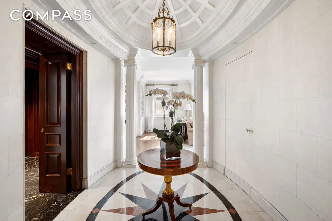 Upon entering, you are greeted by a warm mahogany foyer that leads to a grand marble gallery adorned with elegant Ionic columns and a hand-carved oval dome ceiling, complete with a convenient powder room. The formal living room, filled with abundant light, offers stunning views of Central Park, while the adjacent dining room/library boasts meticulously hand-painted coffered ceilings, adding a touch of artistry to your gatherings.