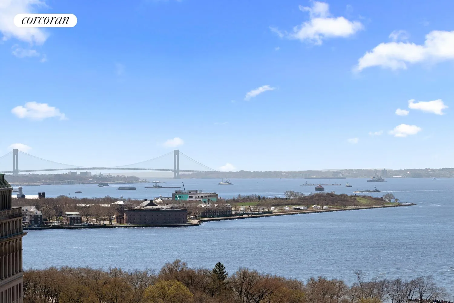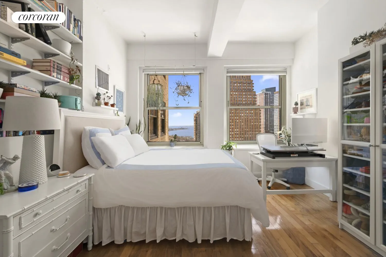 The living space is bathed in natural light through two oversized windows that showcase breathtaking, unobstructed views of the Lower Manhattan skyline along with captivating glimpses of New York Harbor. From sunlit mornings to dramatic sunsets, the ever-changing cityscape becomes a stunning backdrop to daily life.