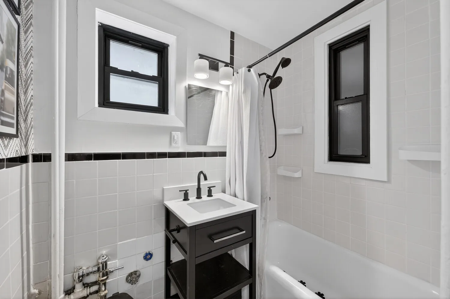 The updated kitchen features stainless steel appliances, including a dishwasher, along with ample counter space and cabinetry. The bathroom is finished in a classic black-and-white palette with clean, timeless details.