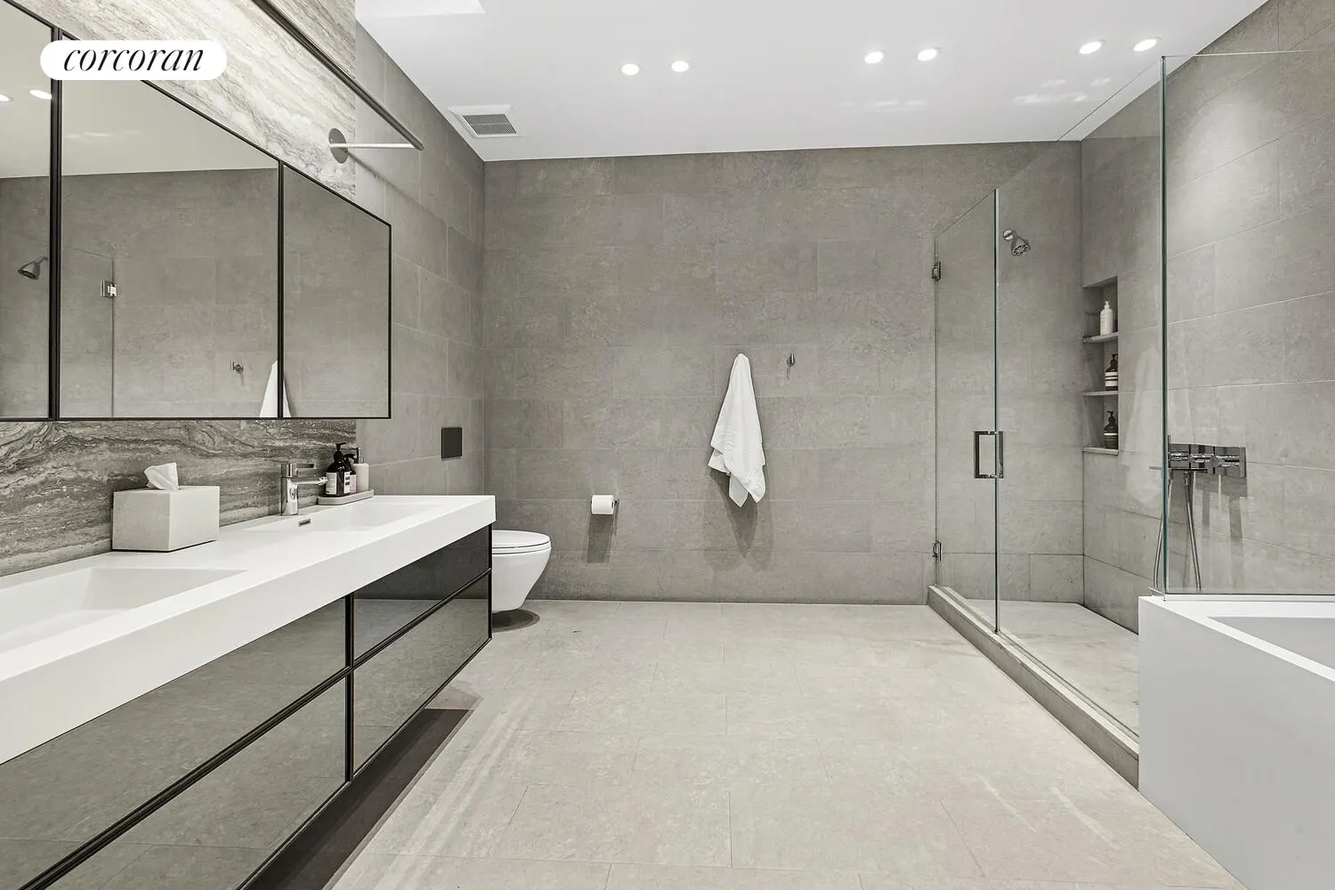 The serene primary suite occupies its own wing, complete with dual walk-in closets and a spa-quality bath wrapped in French limestone. An oversized soaking tub, generous walk-in shower, dual vanities, radiant heated floors, and premium Hansgrohe and WetStyle fixtures elevate the experience to everyday luxury and pure relaxation.