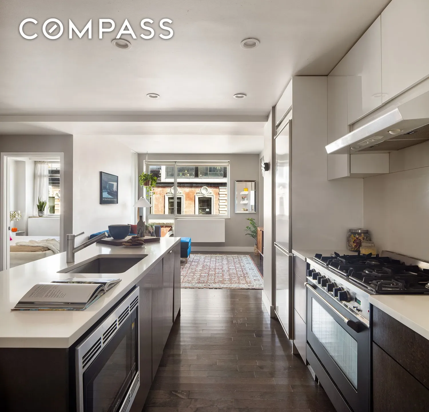 Step inside to a chef’s kitchen designed for both function and flair—complete with a center island, separate dining area, Leibherr refrigerator, Bosch appliances, and a DeLonghi five-burner range. The spacious living room is framed by oversized north-facing windows, filling the space with soft, steady natural light—perfect for relaxing with a book, entertaining friends, or creating a cozy, artful home.