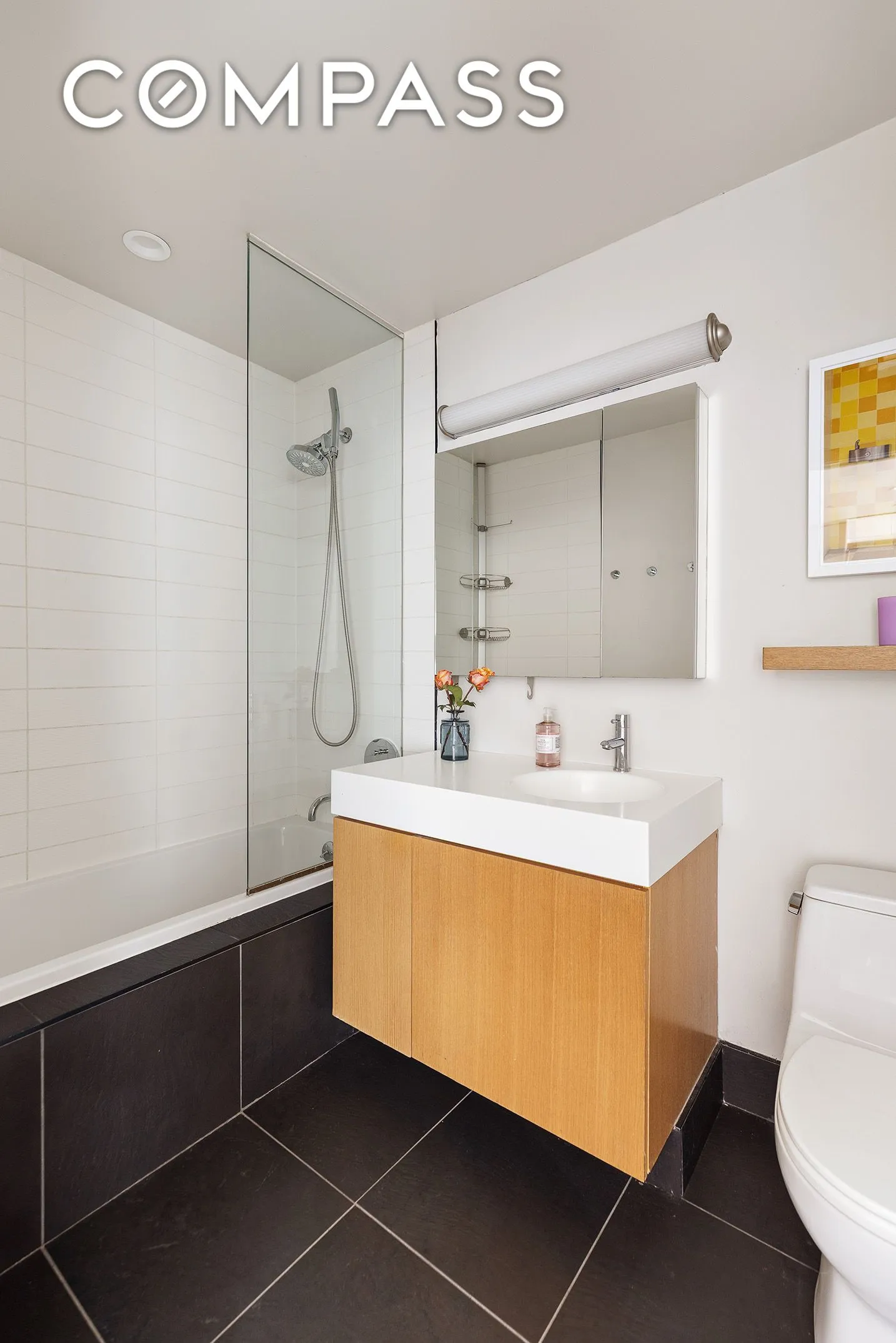 The spa-like bathroom pampers with a 63" Duravit soaking tub, rain showerhead, Senza stone tile, and Toto commode. Thoughtful touches like an in-unit Bosch washer/dryer, custom Elfa closets, recessed lighting, and charcoal-stained hardwood floors elevate the everyday. A large storage unit and reserved bike storage add even more convenience.