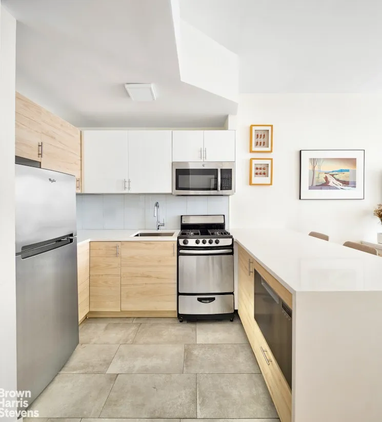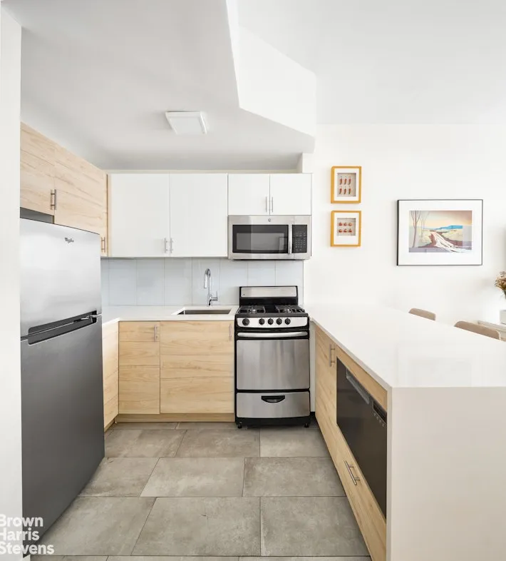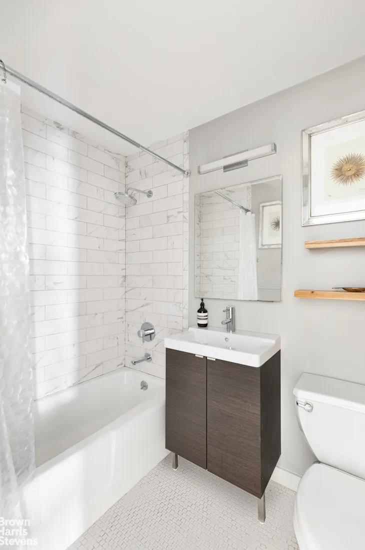 2J at 9 Barrow Street is a renovated loft-like studio that features oak floors throughout, dramatically high ceilings, three oversized windows, and a bright Eastern exposure. The apartment offers three spacious custom closets, and a newly installed through-wall heating and cooling system ensures year-round comfort. The modern kitchen features a breakfast bar, white quartz countertops and stainless-steel appliances (including a built-in microwave and dishwasher). The bathroom is outfitted in marble tile and features fixtures by Grohe, including a tub and waterfall shower head. The vanity and mirrored medicine cabinet provide ample storage space.