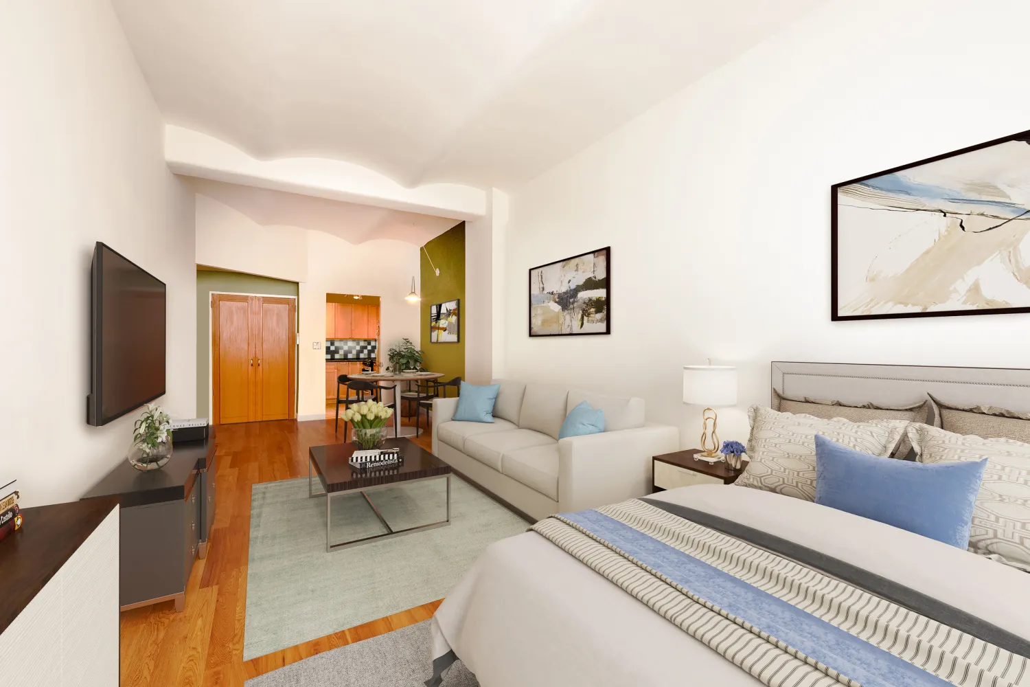 Experience the opportunity to live in one of ΝΥC's most coveted areas with this Vintage Printing Factory Apartment, located at the prime intersection of West 4th and Barrow in the heart of the Village! This charming, oversized studio apartment features soaring vaulted ceilings and original details, creating a loft-like aesthetic that enhances the spacious, open living area. Large windows flood the hardwood floors with natural light, and the kitchen is equipped with full-sized appliances and ample counter and cabinet space. The bathroom includes a mirrored vanity/storage cabinet and a full-sized tub.