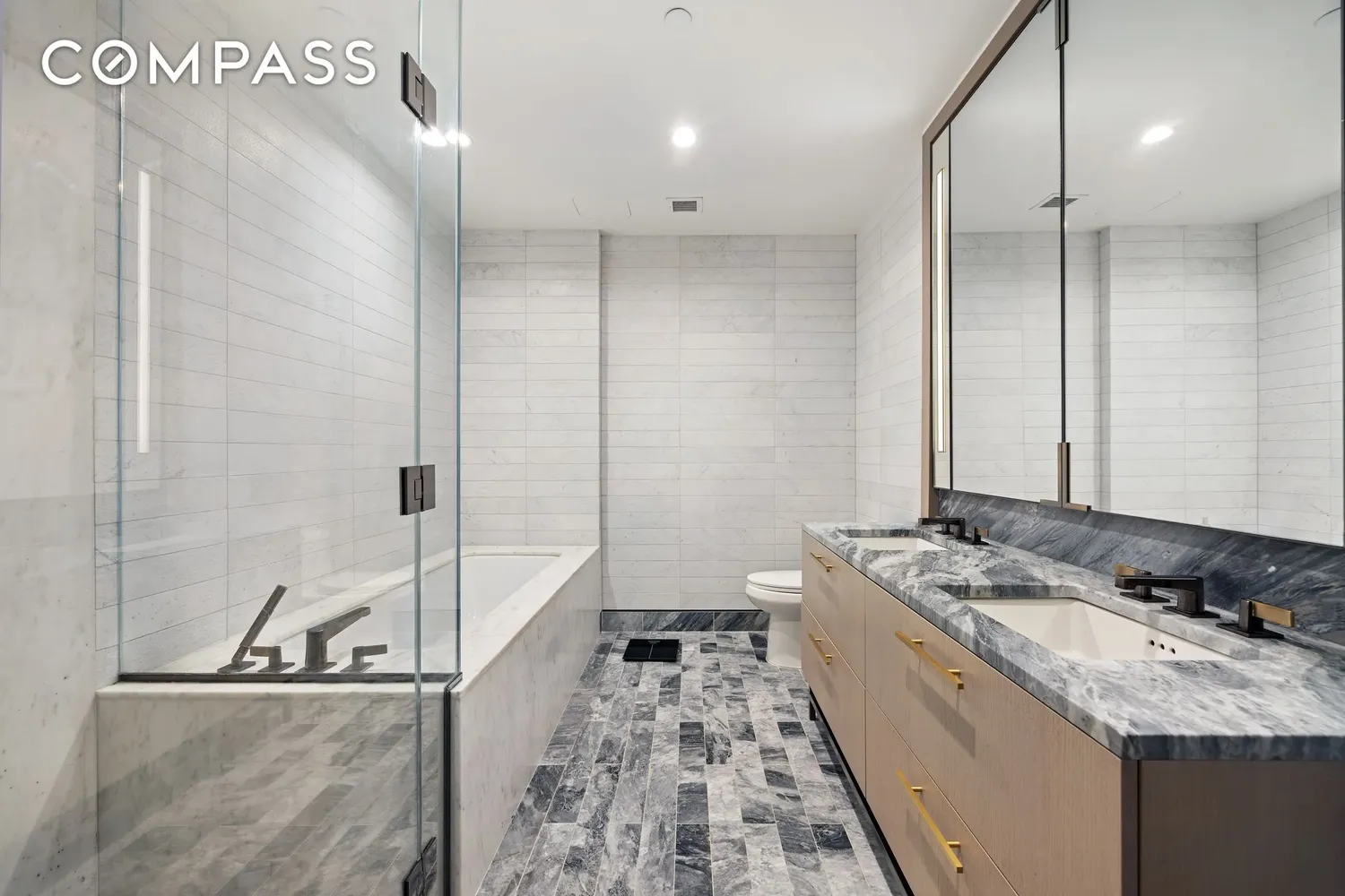 The primary bedroom includes a custom floor-to-ceiling wood built-in for additional storage. The en-suite bath is finished with Bardiglio marble floors, Poliform oak vanities and medicine cabinets with brass and pewter detailing, and Watermark plumbing fixtures. The shower has been extended to increase usable space and improve layout efficiency.