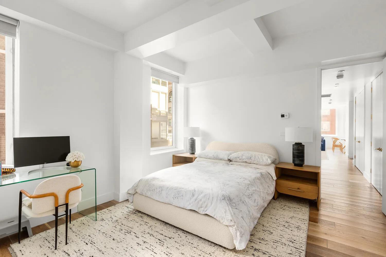 Bathed in natural light through oversized 7-foot loft windows with open northern and eastern exposures, the residence features soaring ceilings, wide-plank 7-inch white oak floors, and refined detailing throughout. The expansive primary suite is a true retreat, highlighted by a spa-caliber en-suite bathroom with a cast-iron clawfoot soaking tub, ceiling-mounted rainfall shower, dual vanity, and Waterworks fixtures.