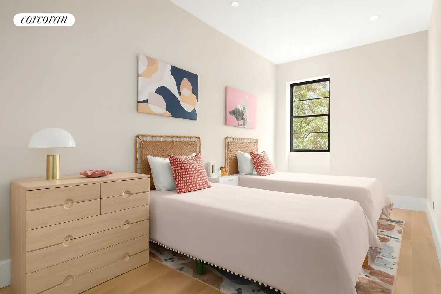 The 45-foot parlor floor stretches from a gracious living and dining area with a decorative fireplace straight into a kitchen that anchors the entire home. Wrapped in custom ashy walnut cabinetry and elegant Calacatta marble, the kitchen is as functional as it is beautiful, with Thermador double wall ovens, an integrated dishwasher, and full-height separate Fisher & Paykel refrigerator and freezer framing a perfect wet bar. A discreet pantry adds storage and utility, while oversized sliding glass doors extend the space onto a South-facing deck overlooking the backyard. Even the powder room makes a statement with bold wallpaper.